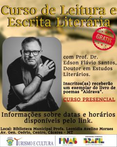 Estão abertas as inscrições para o Curso de Escrita e Leitura Literária ministrado pelo Prof. Edson Flávio, autor das obras Aldrava (2020), Utopias e resistências na obra de Pedro Casaldáliga – escritos escolhidos (2021), Intermitência (2023) e Antes do Amanhã (2024).