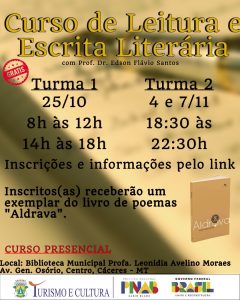 Os participantes receberão um exemplar do livro de poemas “Aldrava”, de autoria de Edson Flávio, que é doutor em estudos literários e docente na área de literatura há mais de 20 anos.