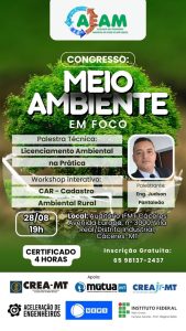 O Congresso “Meio Ambiente em Foco” chega à sua 2ª edição e, pela primeira vez, será realizado em Cáceres, no dia 28 de agosto, às 19h, no Auditório do IFMT Cáceres. O evento é viabilizado pelo Conselho Regional de Engenharia e Agronomia de Mato Grosso (Crea-MT) por meio do Edital de Chamamento 001/2025 e realizado pela Associação dos Engenheiros Ambientais do Estado de Mato Grosso (AEAM-MT), especialmente para atender profissionais e estudantes da região.
