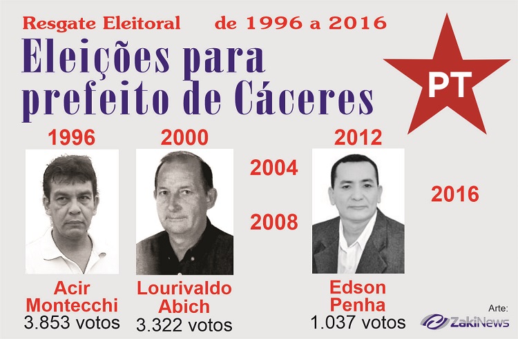 O Partido dos Trabalhadores (PT) em Cáceres vem registrando, desde às eleições de 1996, números vergonhosos para quem esteve no comando do poder central entre os anos de 2002 a 2015. Nesse período, o Brasil estava sob o comando dos presidentes Luiz Inácio Lula da Silva e Dilma Rousseff.