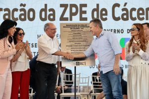 O governador Mauro Mendes e a primeira-dama Virginia Mendes, com a presença do presidente em exercício, Geraldo Alckimin, inauguraram a Zona de Processamento de Exportações, a ZPE de Cáceres, que recebeu investimento total de R$ 51,3 milhões do Governo do Estado.