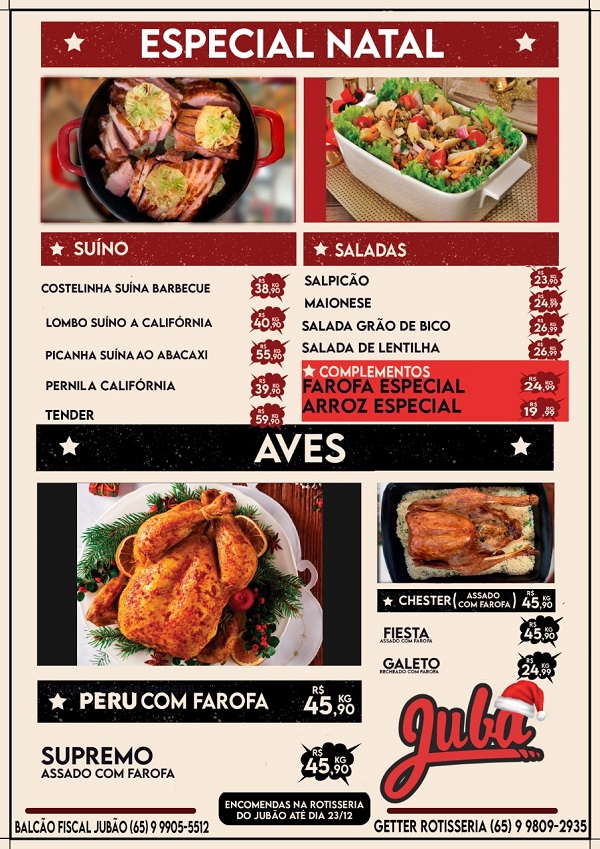 Já o gerente Alexandre Vieira comemora a iniciativa e avisa que os pratos são feitos com a qualidade Juba Supermercados e foram criados pelo Chef Geter de Oliveira, respeitando a tradição dos pratos típicos das ceias brasileiras, com produtos e ingredientes da própria loja. “Costelinha suína barbecue, lombo suíno a califórnia, picanha suína ao abacaxi, pernil a califórnia, tender, salpicão, maionese, saladas de grão de bico e lentilha, aves festivas, peru com farofa, chester, fiesta, supremo , galeto e complementos com arroz e farofa especiais”, anuncia Vieira.