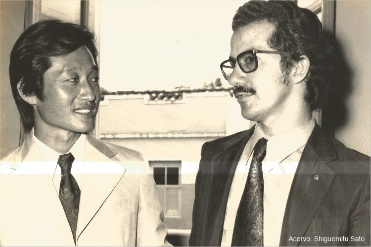 Vereador eleito Shiguemitu Sato conversando com o advogado cacerense Ladislau Ramos, durante solenidade de Posse em 1973